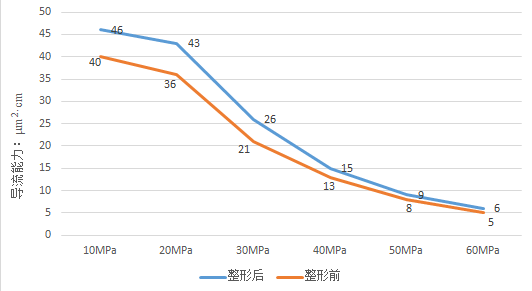 整形前后石英砂导流能力对比:40/70目(铺置浓度10kg/m2)