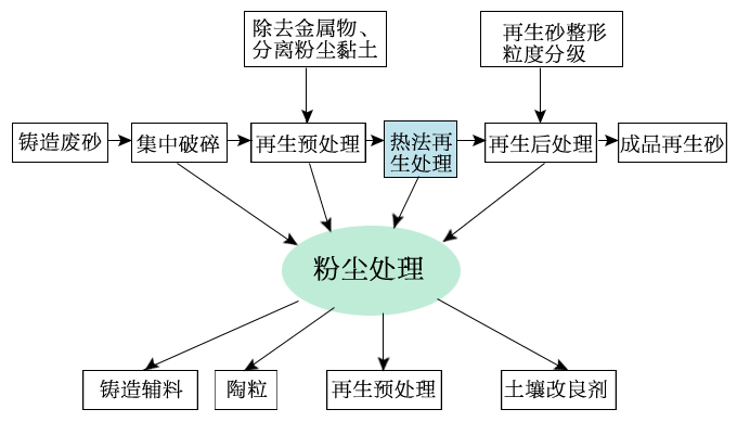废砂再生过程的废弃物有粉尘、粗渣、金属等。 规范二次废弃物的分离与收集;对物料分类,进行无害化的处理,避免传输及处理过程中的二次污染。