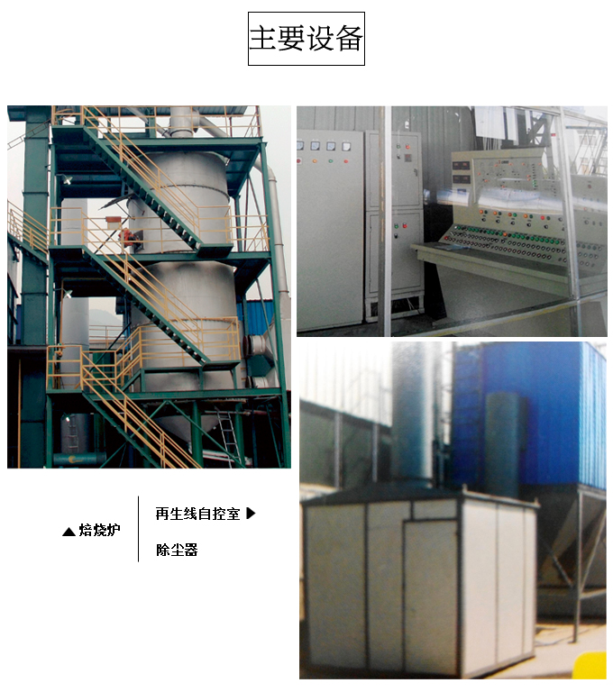 主要设备 1.焙烧炉(专利产品)【证书号:第1158952号 】 2.砂冷却系统 3.燃烧系统 4.预热干燥炉 5.风力分级器 6.离心再生机(专利产品 )【证书号:第862189号】