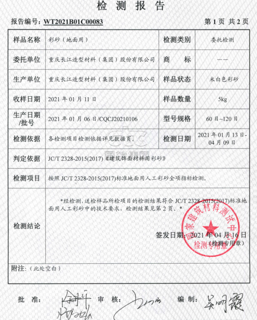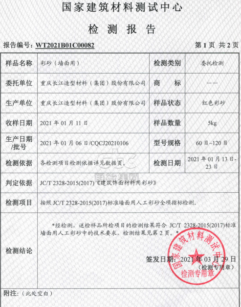 长江焙烧彩砂已经通过国家建筑材测试中心的权威检测,符合行业标准要求。