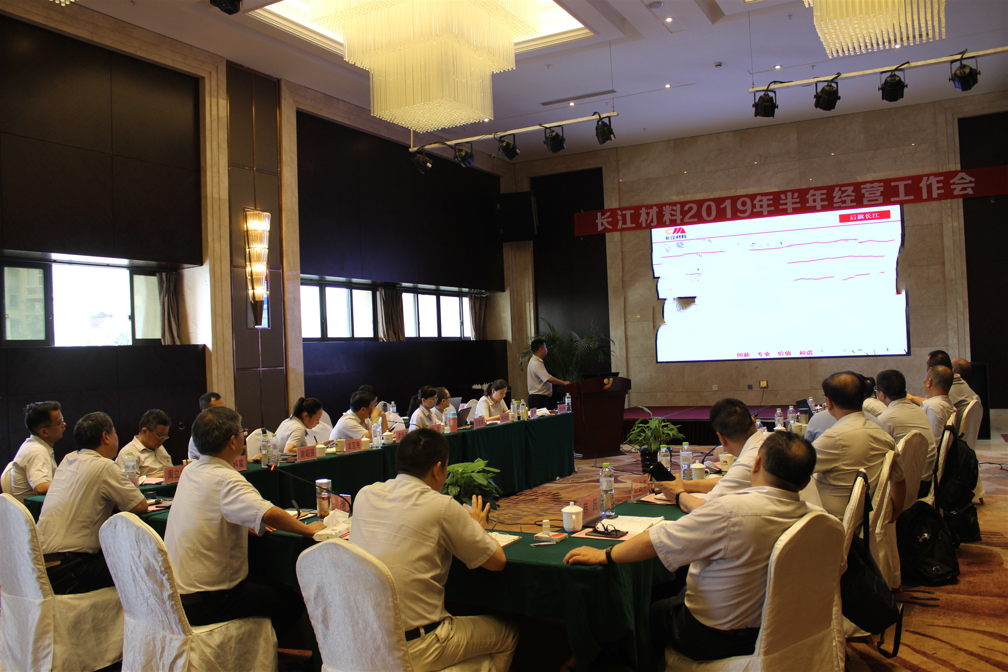 “长江材料2019年半年经营工作会”于2019年7月19日至22日在重庆召开。会期三天。集团高管、各子总经理和职能中心总监共23人参加了会议。会上八家效益中心汇报了本单位上半年生产经营情况和下半年措施计划;七个职能管理中心通报上半年工作完成情况和下半年工作计划。会期对参会人员进行了财务和法务知识培训。
